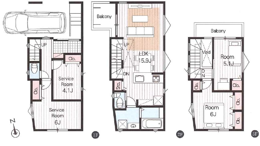 1階洋室6畳 1階洋室4.1畳 2階LDK15.9畳 3階洋室6畳 3階洋室5.1畳