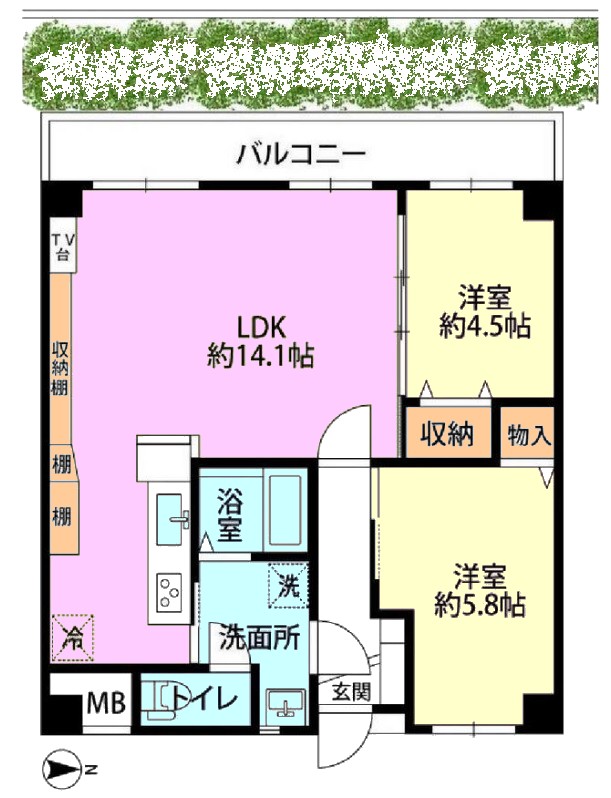 | 間取り内訳 | LDK14.1畳1室 洋室5.8畳1室 洋室4.5畳1室 |