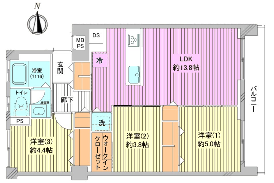 | 間取り内訳 | LDK13.8畳1室 洋室5畳1室 洋室3.8畳1室 洋室4.4畳1室 |