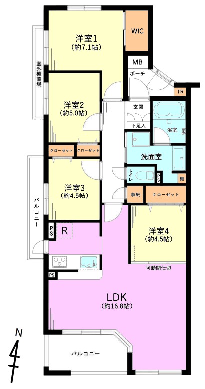 | 間取り内訳 | LDK16.8畳1室 洋室7.1畳1室 洋室5畳1室 洋室4.5畳2室 |