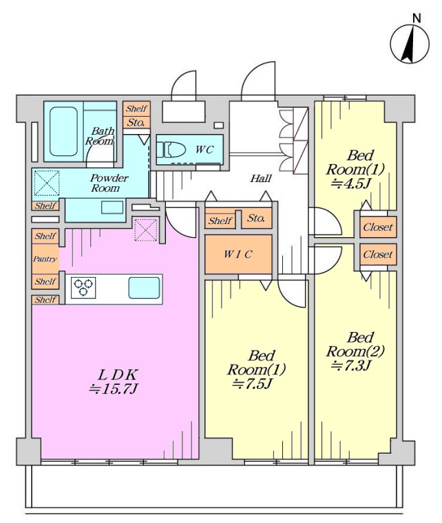 | 間取り内訳 | LDK15.7畳1室 洋室7.5畳1室 洋室7.3畳1室 洋室4.5畳1室 |