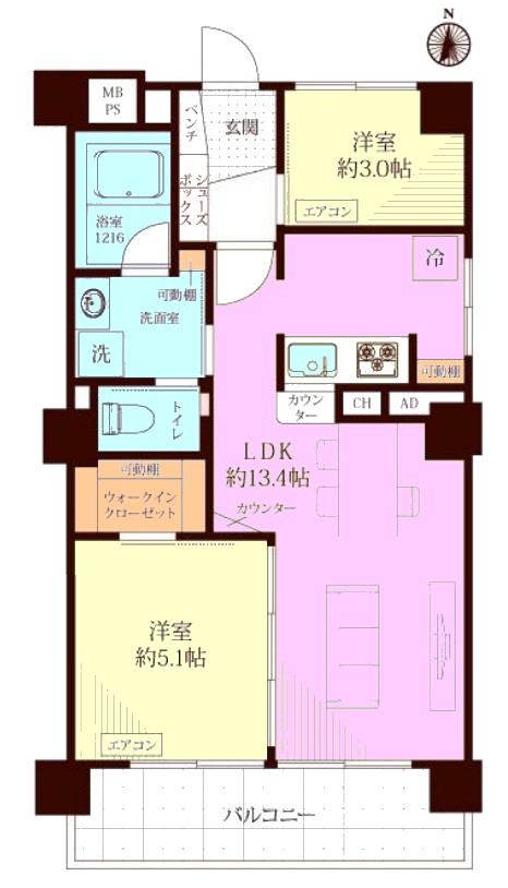| 間取り内訳 | LDK13.4畳1室 洋室5.1畳1室 洋室3畳1室 |