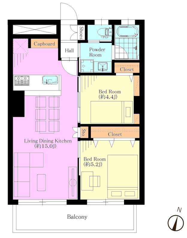 | 間取り内訳 | LDK15畳1室 洋室5.2畳1室 洋室4.4畳1室 |