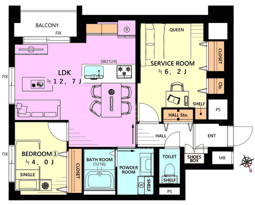 | 間取り内訳 | LDK12.7畳1室 洋室4畳1室 S6.2畳1室 |