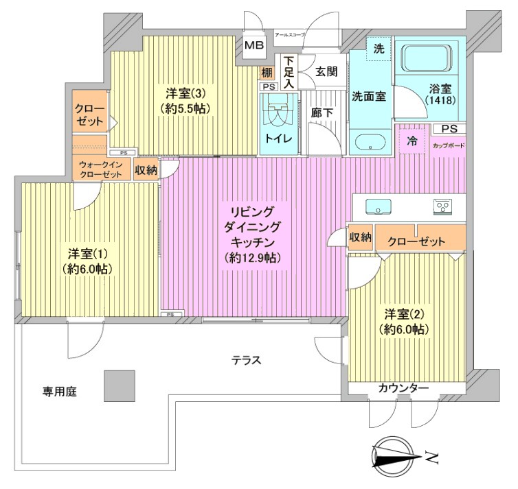 | 間取り内訳 | LDK12.9畳1室 洋室6畳2室 洋室5.5畳1室 |