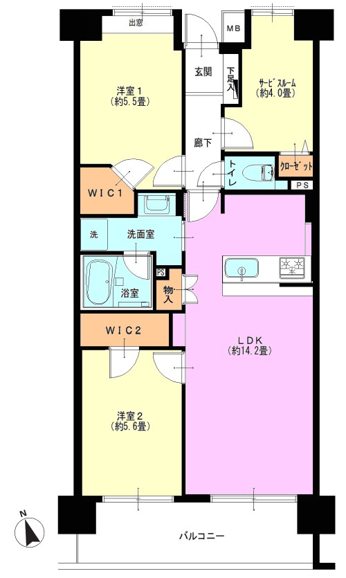 | 間取り内訳 | LDK14.2畳1室 洋室5.6畳1室 洋室5.5畳1室 S4畳1室 |