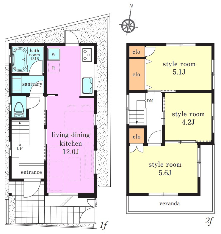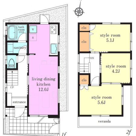 | 間取り内訳 | 1階LDK12畳1室 2階洋室5.6畳1室 2階洋室5.1畳1室 2階洋室4.2畳1室 |