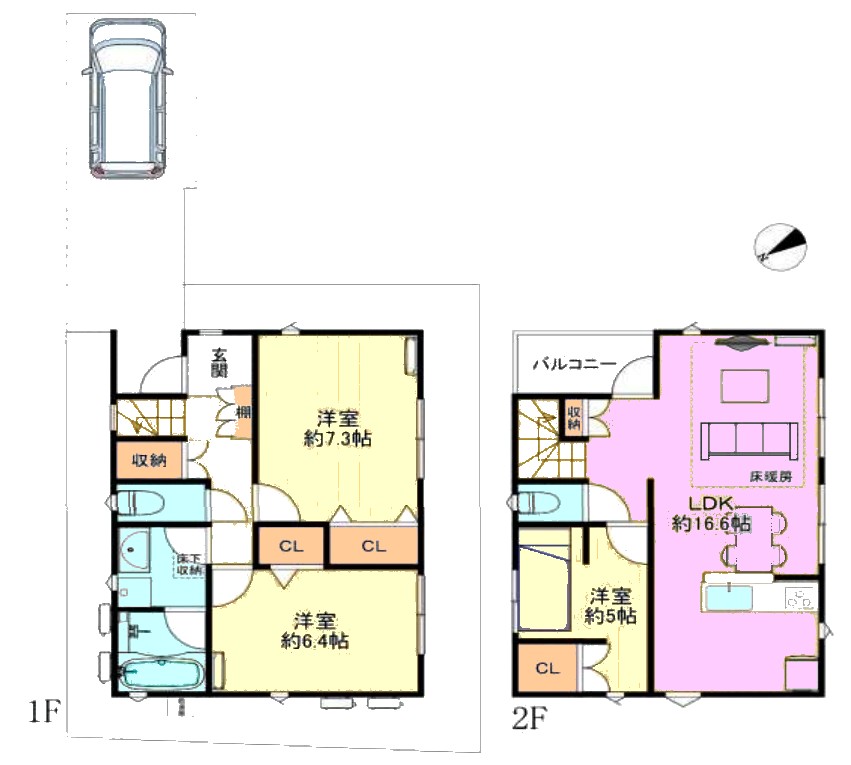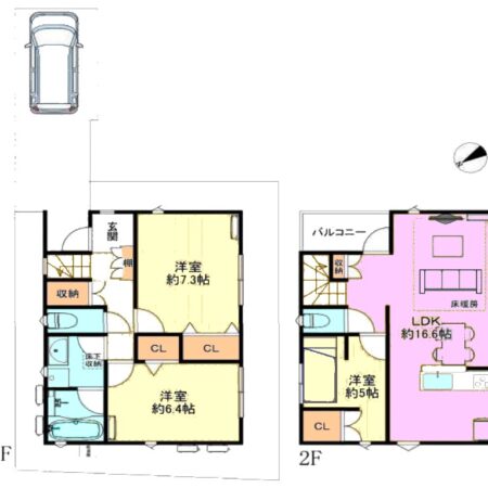 | 間取り内訳 | 2階LDK16.6畳1室 2階洋室5畳1室 1階洋室7.3畳1室 1階洋室6.4畳1室 |