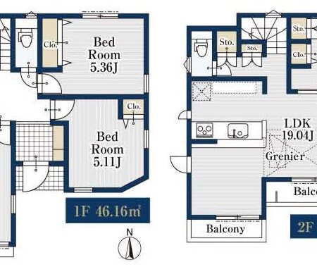 | 間取り内訳 | 1階洋室6.1畳 1階洋室5.1畳 1階洋室5.3畳 2階洋室5.3畳 2階LDK19畳 |
