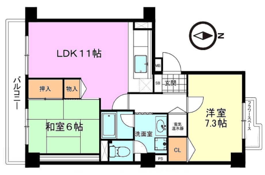 | 間取り内訳 | LDK11畳1室 和室6畳1室 洋室7.3畳1室 |