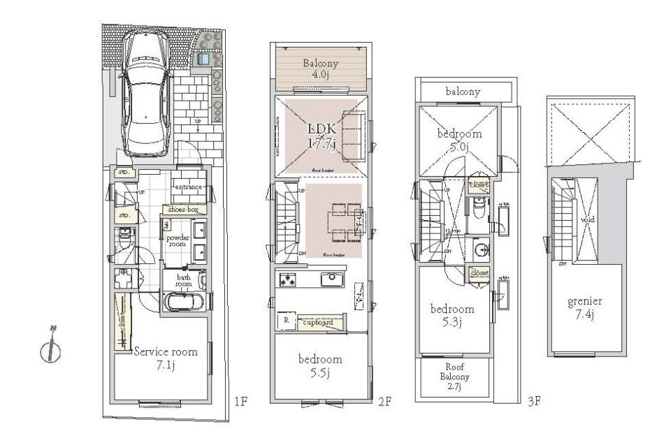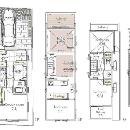 | 間取り内訳 | 1階洋室7.1畳 2階LDK17.7畳 2階洋室5.5畳 3階洋室5.3畳 3階洋室5畳 |