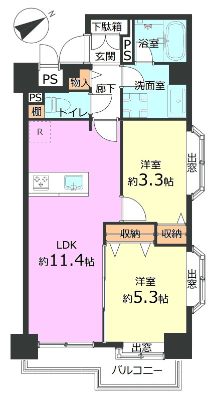 | 間取り内訳 | LDK11.4畳1室 洋室5.3畳1室 洋室3.3畳1室 |