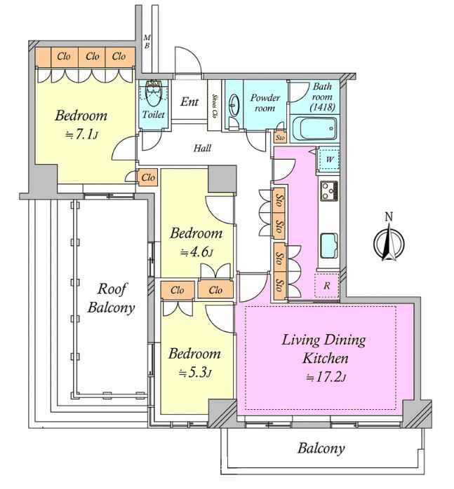| 間取り内訳 | LDK17.2畳1室 洋室7.1畳1室 洋室5.3畳1室 洋室4.6畳1室 |