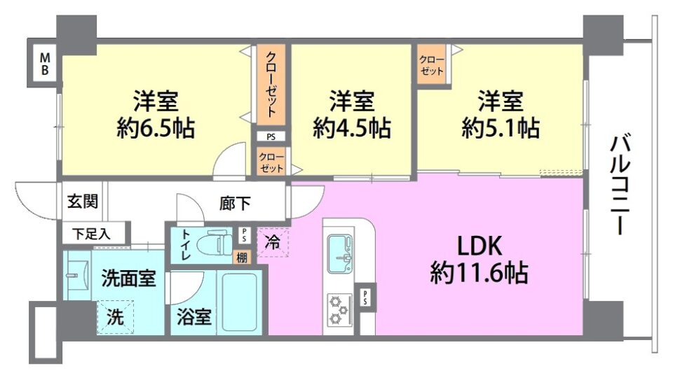 | 間取り内訳 | LDK11.6畳1室 洋室6.5畳1室 洋室5.1畳1室 洋室4.5畳1室 |