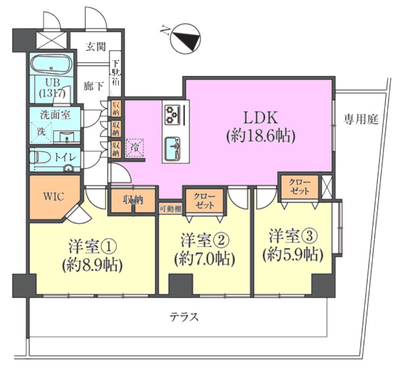 | 間取り内訳 | LDK18.6畳1室 洋室8.9畳1室 洋室7畳1室 洋室5.9畳1室 |
