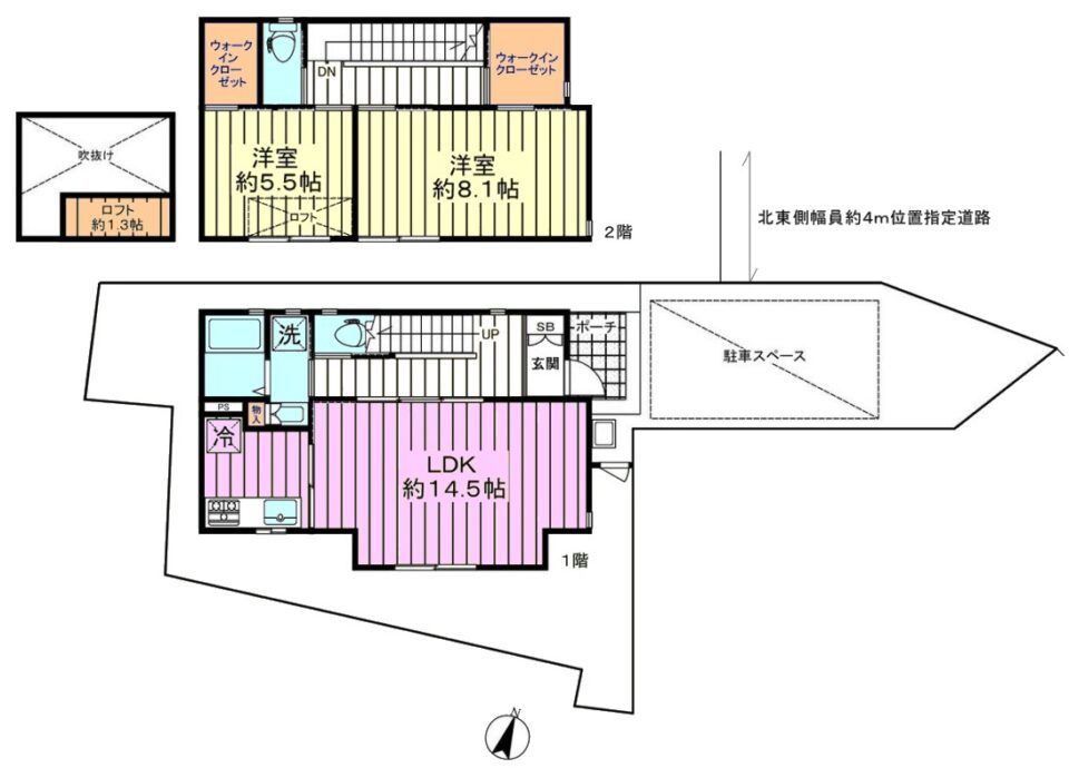| 間取り内訳 | 1階LDK14.5畳1室 2階洋室8.1畳1室 2階洋室5.5畳1室 |