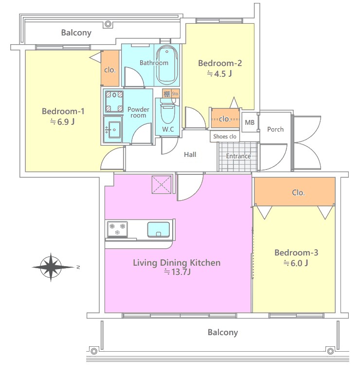 | 間取り内訳 | LDK13.7畳1室 洋室6.9畳1室 洋室6畳1室 洋室4.5畳1室 |