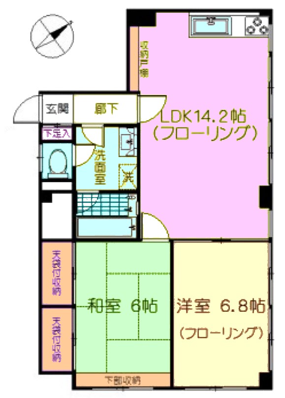 | 間取り内訳 | LDK14.2畳1室 和室6畳1室 洋室6.8畳1室 |