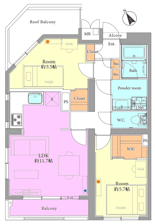 | 間取り内訳 | LDK11.7畳1室 洋室5.7畳1室 洋室5.5畳1室 |