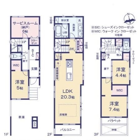 1階洋室5畳 1階洋室6畳 2階LDK20.3畳 3階洋室7.4畳 3階洋室4.4畳
