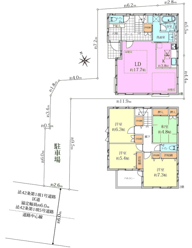 | 間取り内訳 | 1階LDK17.7畳1室 2階和室4.8畳1室 2階洋室7.3畳1室 2階和室6.3畳1室 2階洋室5.4畳1室 |