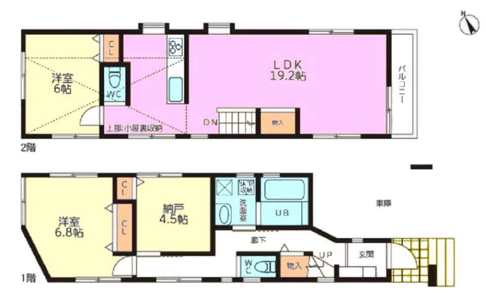 | 間取り内訳 | 2階LDK19.2畳1室 2階洋室6畳1室 1階洋室6.8畳1室 1階S4.5畳1室 |