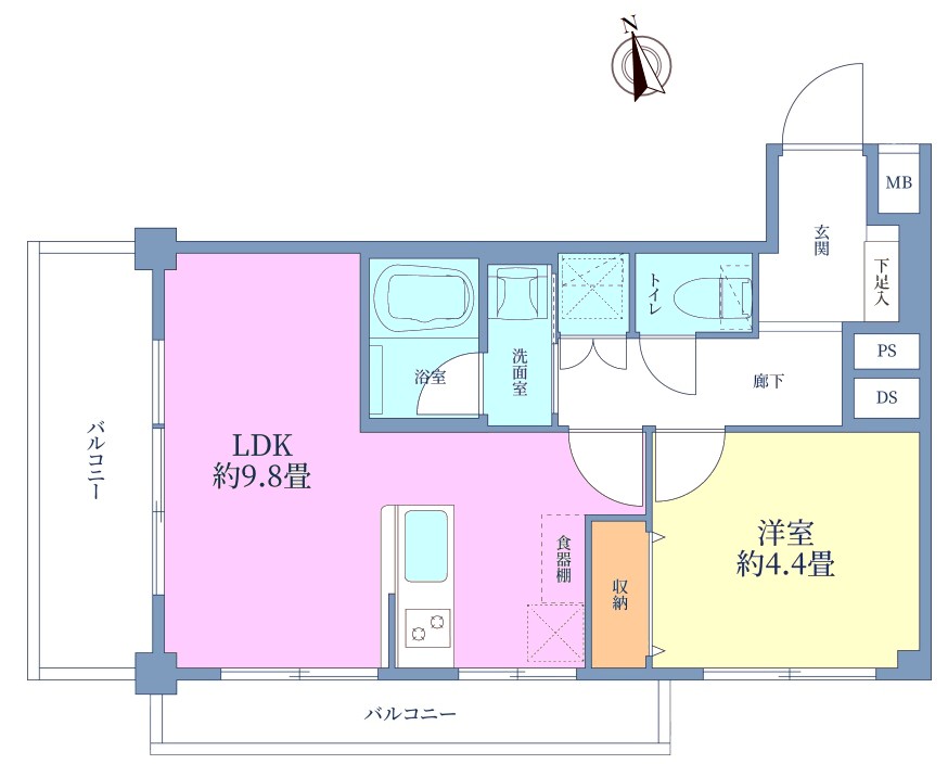 | 間取り内訳 | LDK9.8畳1室 洋室4.4畳1室 |