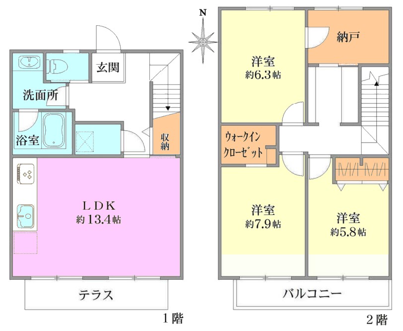 | 間取り内訳 | LDK13.4畳1室 洋室7.9畳1室 洋室6.3畳1室 洋室5.8畳1室 |