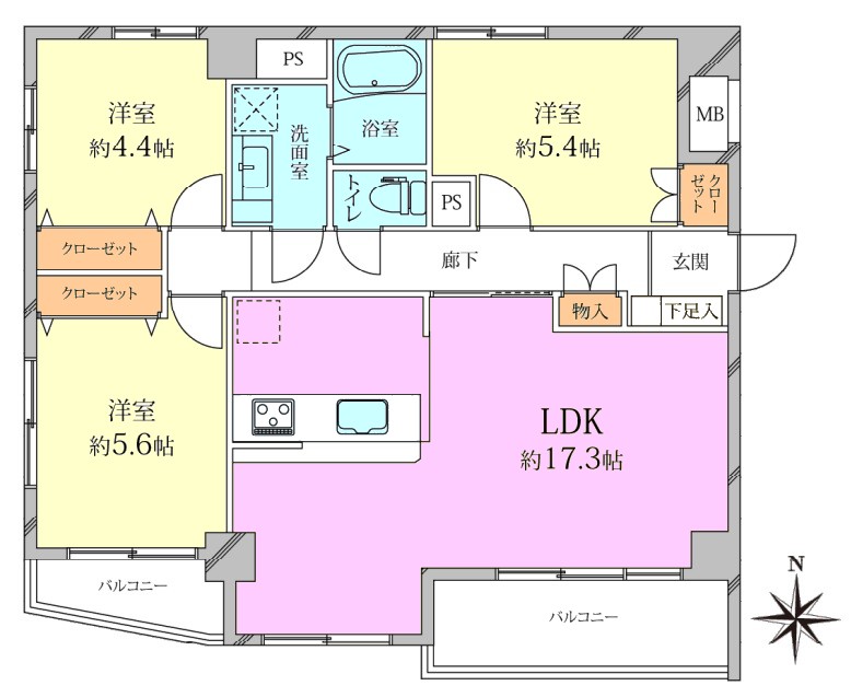 | 間取り内訳 | LDK17.3畳1室 洋室5.6畳1室 洋室5.4畳1室 洋室4.4畳1室 |
