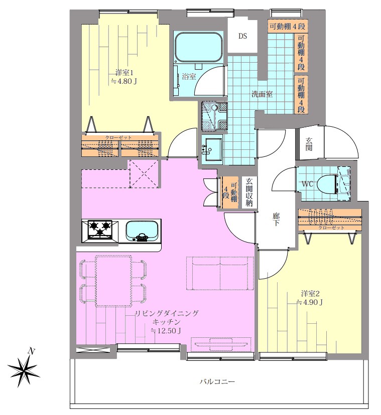 | 間取り内訳 | LDK12.5畳1室 洋室4.9畳1室 洋室4.8畳1室 |