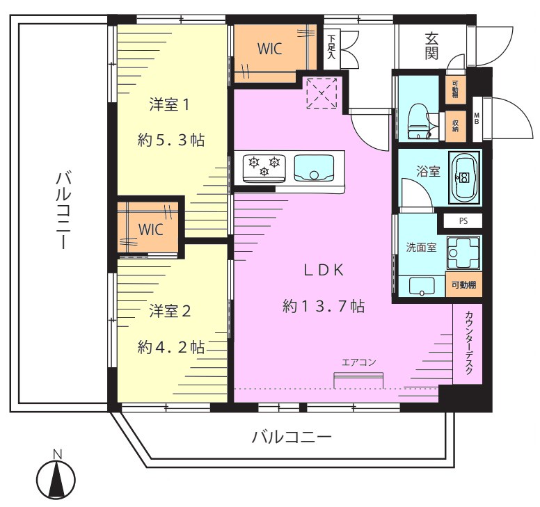 | 間取り内訳 | LDK13.7畳1室 洋室5.3畳1室 洋室4.2畳1室 |