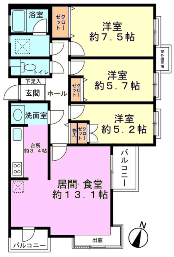 | 間取り内訳 | LDK16.5畳1室 洋室7.5畳1室 洋室5.7畳1室 洋室5.2畳1室 |