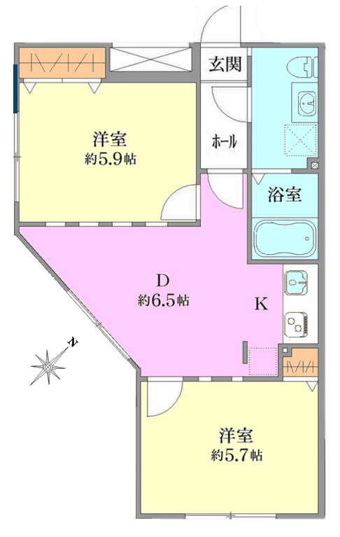 | 間取り内訳 | DK6.5畳1室 洋室5.9畳1室 洋室5.7畳1室 |