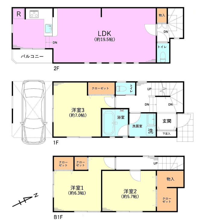間取り内訳 2階LDK19.5畳1室  1階洋室7畳1室  B1階洋室6.3畳1室  B1階洋室5.7畳1室