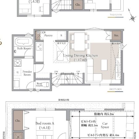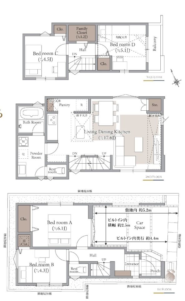 1階洋室6.1畳 1階洋室4.3畳 2階LDK17.6畳 3階洋室5.1畳 3階洋室4.5畳